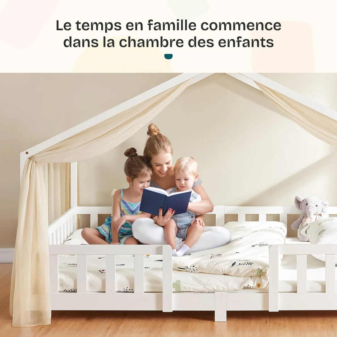 Grand lit cabane avec barrière et matelas - 120x200cm - Blanc