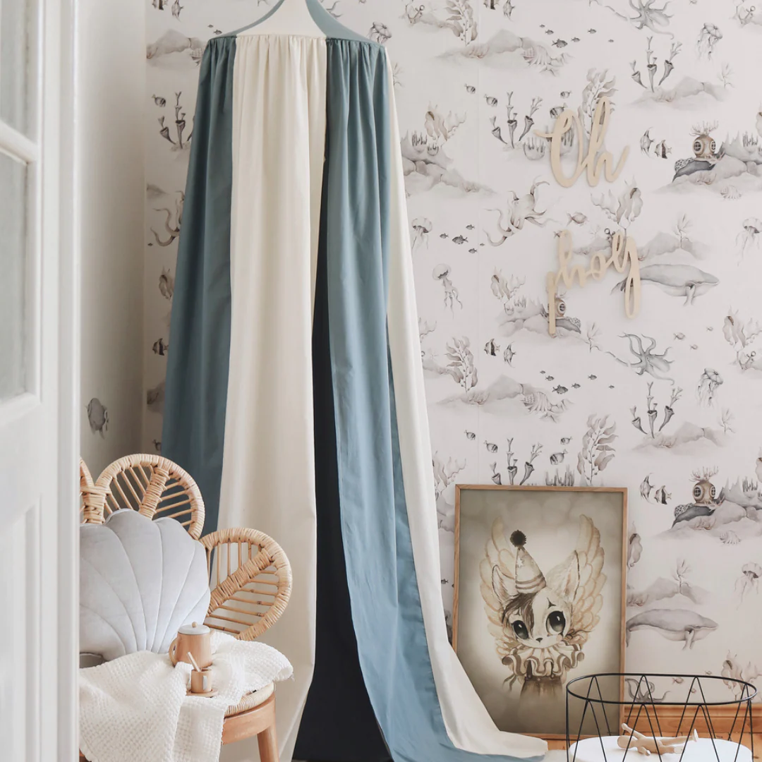 Ciel de lit bébé Bleu & écru - Fait main
