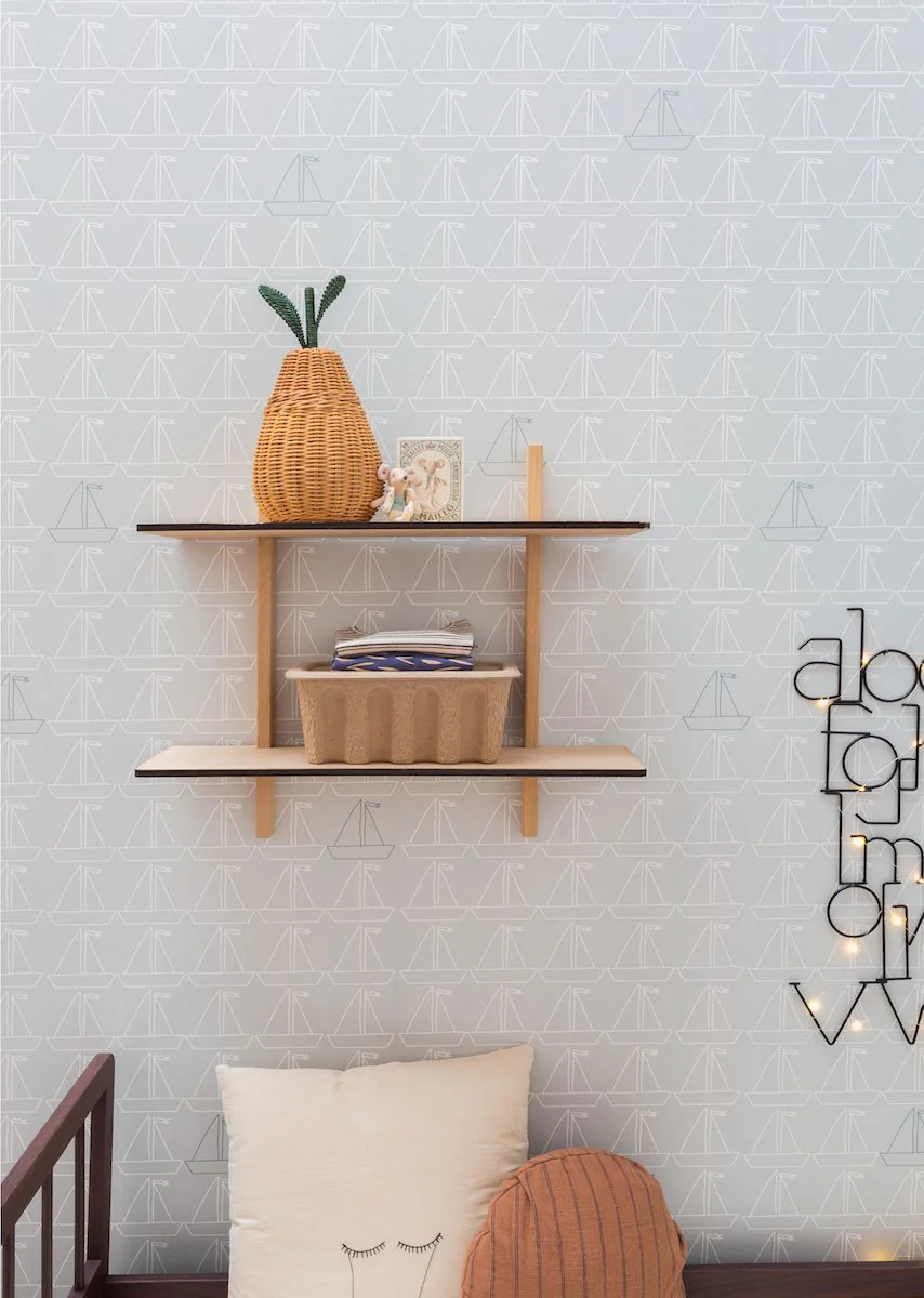 Papier peint chambre enfant Bateau - Gris & Blanc + bleu